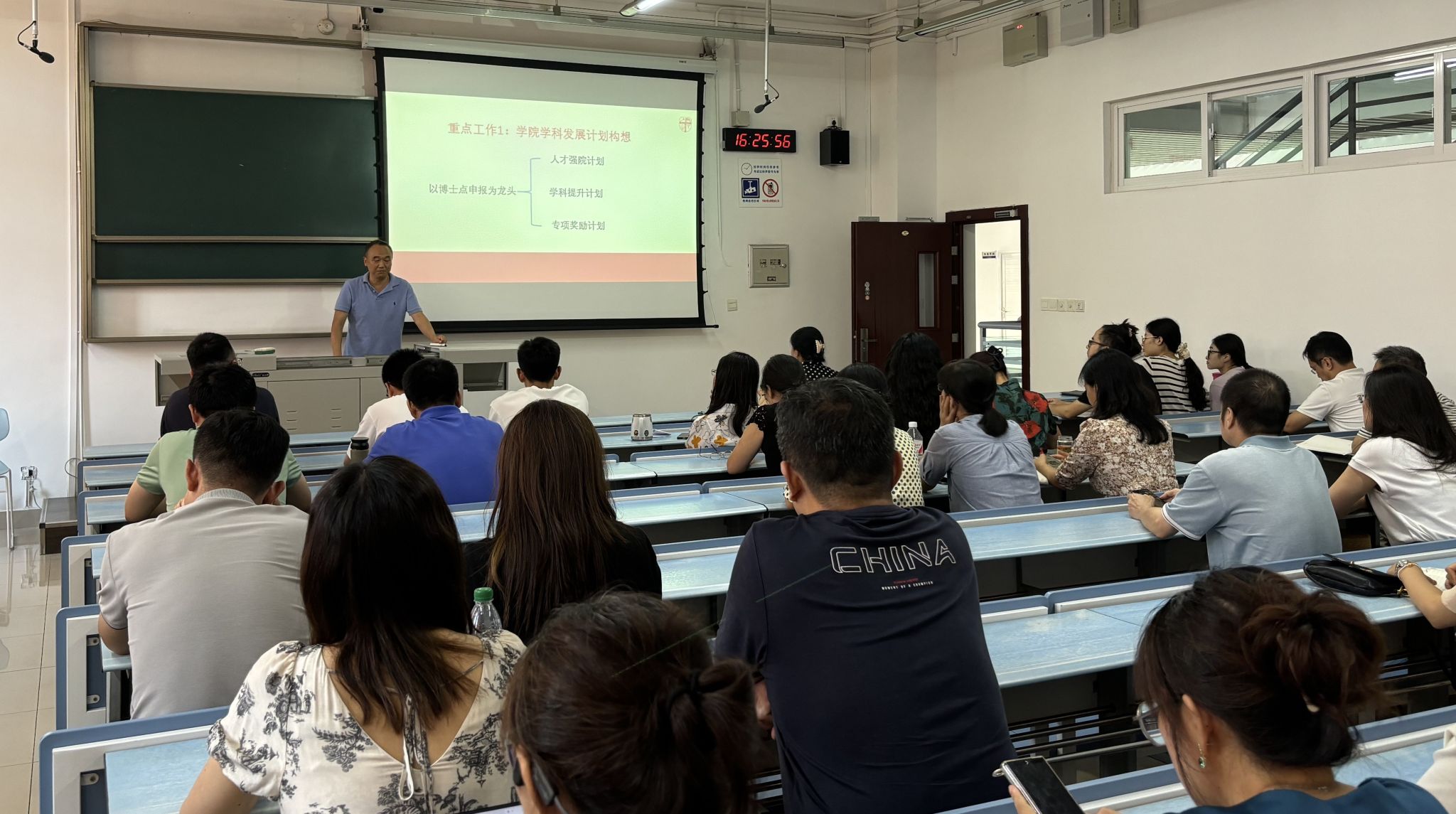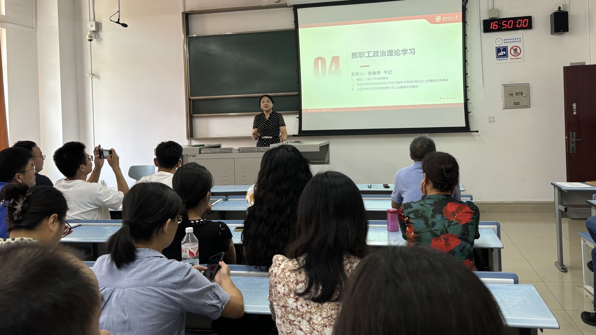 在犀浦校区X2324召开全体教职工大会暨政治理论学习。学院领导班子及全体教职工参加会议,会议由学院党委书记黄春蓉主持。