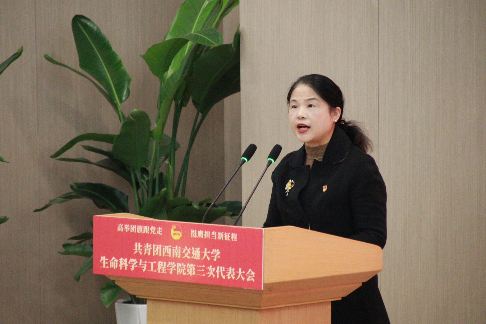 党委书记黄春蓉代表学院党委向大会的召开表示热烈的祝贺,向一直以来关心和支持学院共青团工作的各位领导、老师以及各位青年朋友们表示衷心的感谢,向参会的各位代表致以亲切的问候与美好的祝愿。她对学院共青团各项工作给予了高度肯定并指出,站在新的起点上,学院共青团要强化使命担当,切实增强引领力、组织力、服务力,着力推动各项工作高质量发展。一是坚持旗帜引领,用习近平新时代中国特色社会主义思想凝心铸魂。二是要坚持从严治团,统筹推进学院共青团改革向纵深发展。三是要密切联系青年,关注青年所思所想,解决青年所急所盼。她勉励广大团员和青年,要立志做有理想、敢担当、能吃苦、肯奋斗的新时代好青年,在强国建设、民族复兴的伟大征程上书写属于生命青年的青春华章。