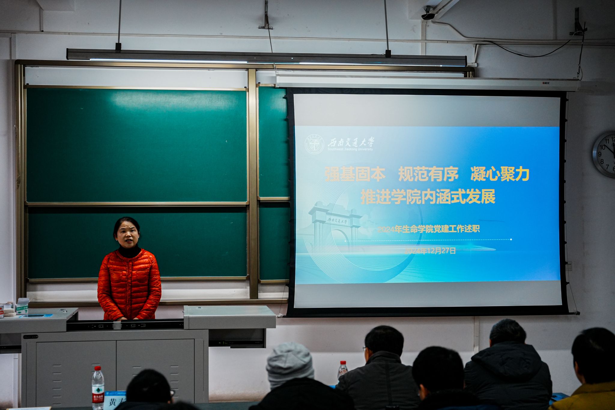 黄春蓉书记代表学院党委作2024年度学院党建工作总结。黄书记以“强基固本 规范有序 凝心聚力 推进学院内涵式发展”为题,从加强政治建设、服务保障中心大局、推进基层党建工作重点任务落实、落实主体责任等四个方面对2024年度工作主要做法及成效进行了总结汇报,分析当下学院党建工作存在的主要问题,为下一步工作明确了目标和重点,同时对学院全体教职工的辛勤付出表示衷心感谢。
