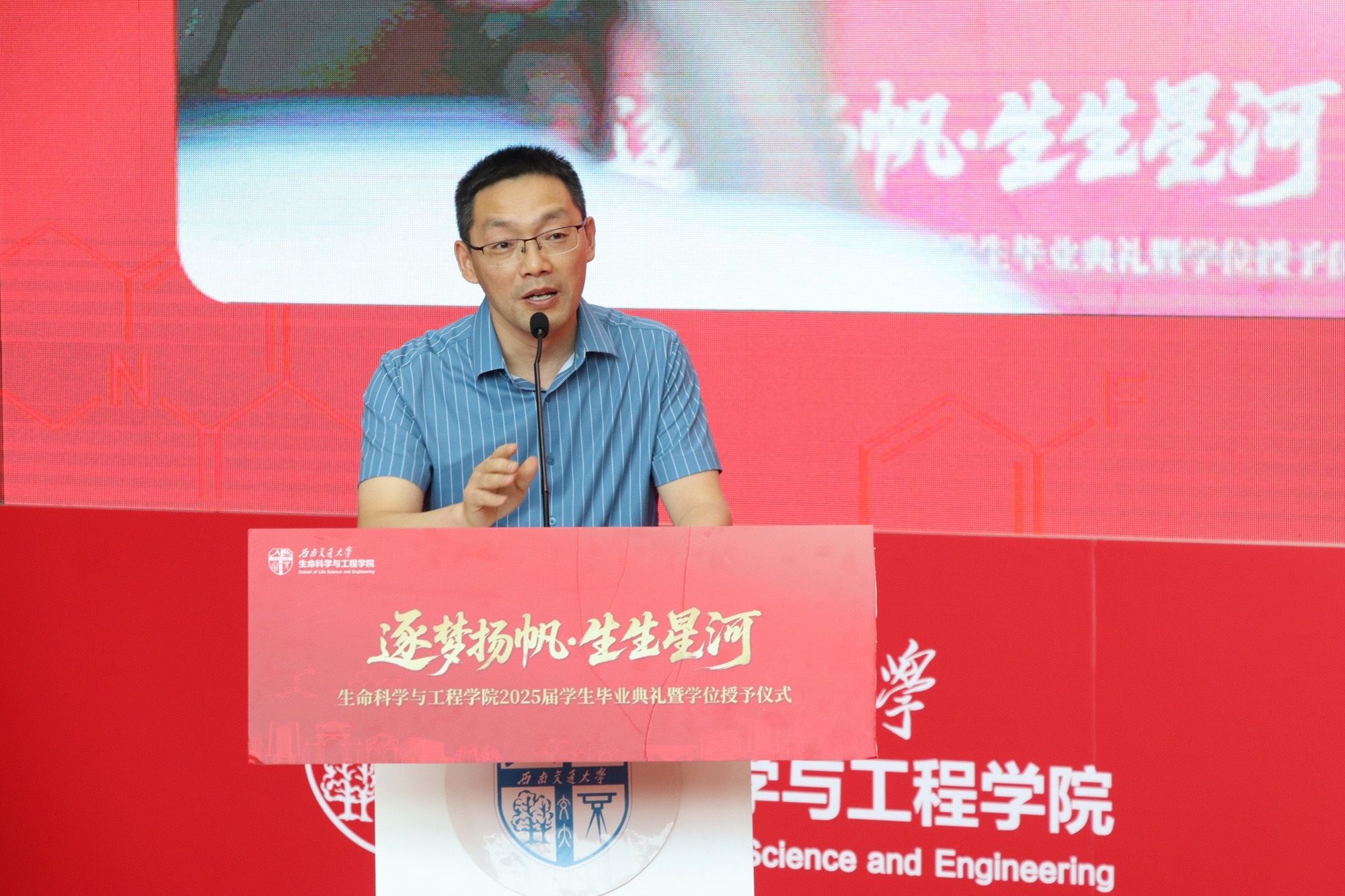 教师代表廖海教授结合自身科研经历,为毕业生送上“人生四课”:毕业是终身学习的新起点,要持续向身边人学习;坚持锻炼保持身心健康;常怀感恩之心;学会欣赏人生风景,在奋斗路上不忘善待自己。毕业生代表陈豪、王嘉莉同学动情回忆了求学时光,感恩学院培养,表示将用实际行动践行新时代交大生命人的使命担当。