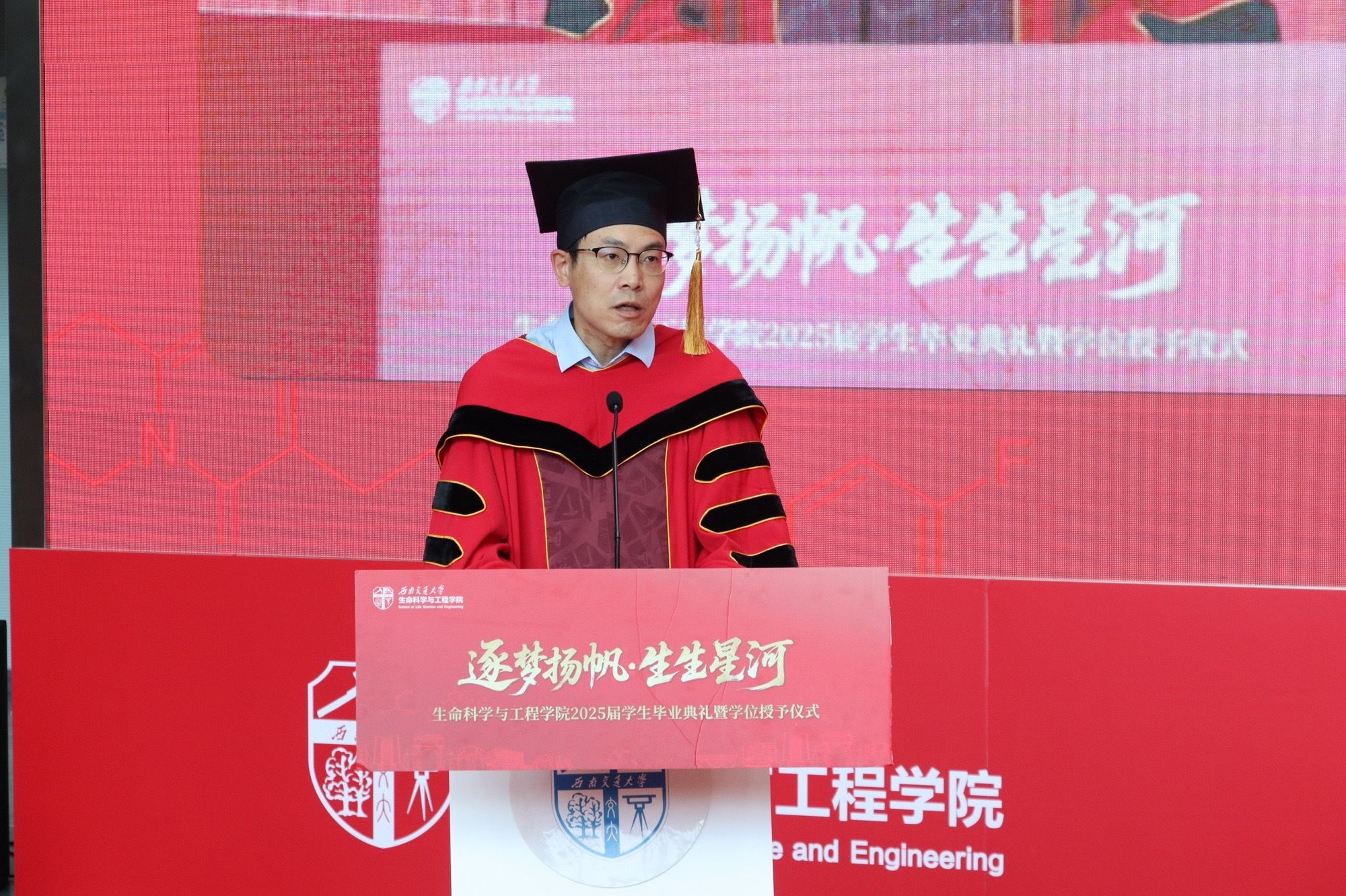 典礼在庄严的国歌声中拉开帷幕。周先礼院长首先致辞,向圆满完成学业的268名本科生、147名硕士研究生和9名博士研究生表示热烈祝贺。周院长深情回顾了同学们在校期间的成长历程,特别指出本届毕业生恰逢学院办学25周年的重要历史节点,面对生命健康产业发展的黄金机遇期,周院长对毕业生提出三点殷切期望:一要心怀“国之大者”,以家国情怀引领人生方向;二要坚守“德之厚者”,以高尚品格筑牢立身之本;三要秉持“行之实者”,以实干精神托举人生梦想。最后,他祝愿全体毕业生前程似锦,并深情表示母校永远是学子们的精神家园。