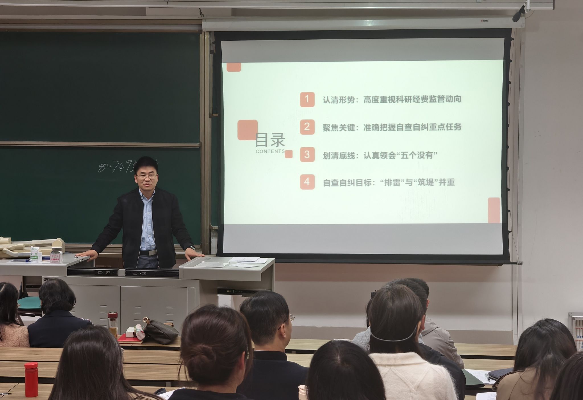 会议第四个议程是开展警示教育。纪委副书记黄新河结合科研经费使用自查工作进行案例剖析和警示教育,重申规范使用科研经费的工作要求和纪律红线,提醒学院各科研团队要提高认识,筑牢思想堤坝,强化合规意识,确保科研工作健康有序开展。