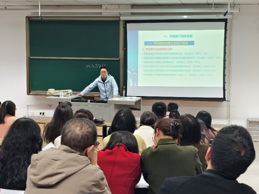 会议的第三个议程是对2025版学院绩效工资分配方案修订的介绍和说明。王毅副院长详细介绍了学院二级管理岗位设置及绩效工资分配实施方案的修订背景与核心原则,对关键调整部分进行一一解读,强调新方案旨在强化“优劳优酬”导向,以更好地激励教职工,推动学科建设、科学研究与人才培养等核心工作的发展。随后,王毅通报了科研经费使用自查工作的总体安排。