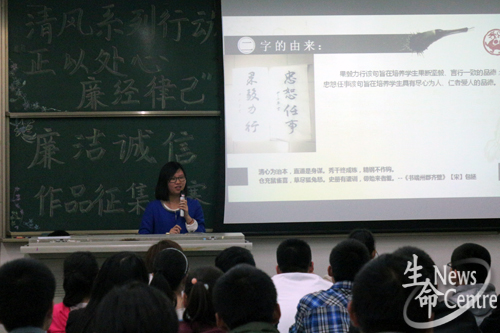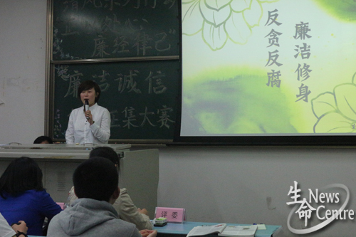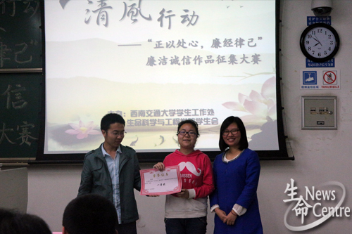 比赛伊始,主持人简单介绍了比赛规则,本场比赛分为作品展示和问答环节。本次决赛共有八组选手参加,表现尤为出色的是第三组选手靳学同学,她以PPT的形式向大家展示了廉洁诚信的重要性,一句“生命的一缕清风飘过,留给我们的是一个干净的毕业季”给大家留下了深刻的印象。接下来的选手们独具特色,为大家进行作品展示,在问答环节同学们个个表现非凡,回答轻松自如,赢得了观众和评委们的热烈掌声。