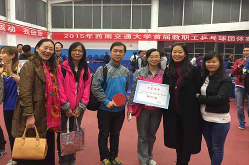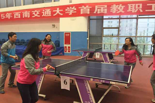 11月12日,西南交通大学首届教职工乒乓球团体赛决赛在犀浦校区乒乓球馆拉开帷幕。出席此次比赛的嘉宾有:校工会主席罗乾超、校工会副主席郑江、校体育部主任刘旭、乒协名誉会长应松宝院长、乒协会长杜力平教授,以及到会的各部门领导。