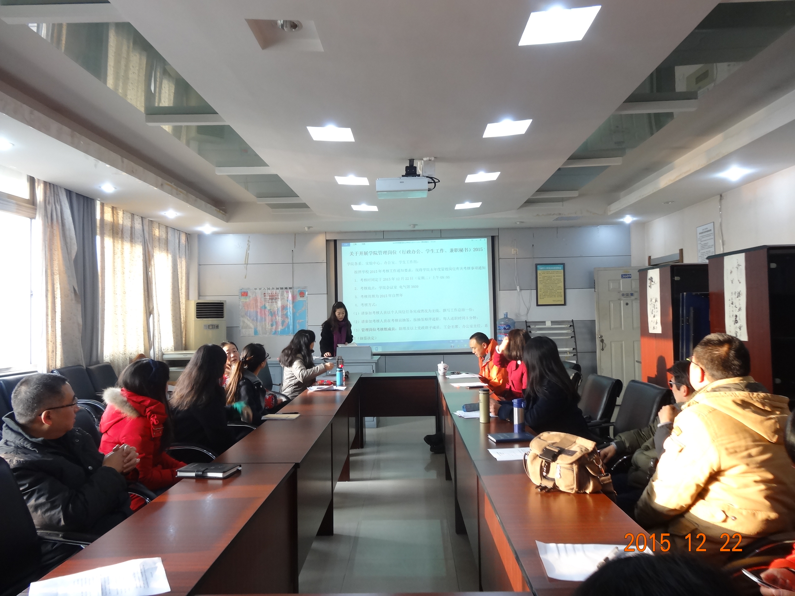 按照学院2015年考核工作安排,12月22上午9:00,学院本年度管理岗位考核工作在九里校区3609会议室顺利进行。管理岗位考核工作组成员有:助理及以上党政班子成员、工会主席、办公室主任、系(中心)负责人、专业教师代表(抽签决定),院党委副书记罗妍妍主持。