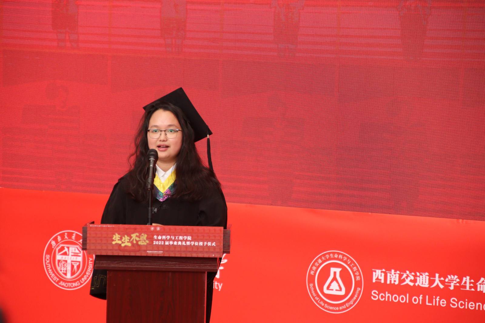 周朝梦同学作为毕业生代表发言。她将自己四年的生活学习经验总结为两点:一要去学习,向身边所有人学习;二要坚持,恪守初心,勇毅前行。她感恩学院老师的辛勤培养、感谢学校提供的广阔平台,鼓励同学们无论在学校深造还是在职场拼搏都要勇敢坚定,牢记“竢实扬华、自强不息”的交大精神。