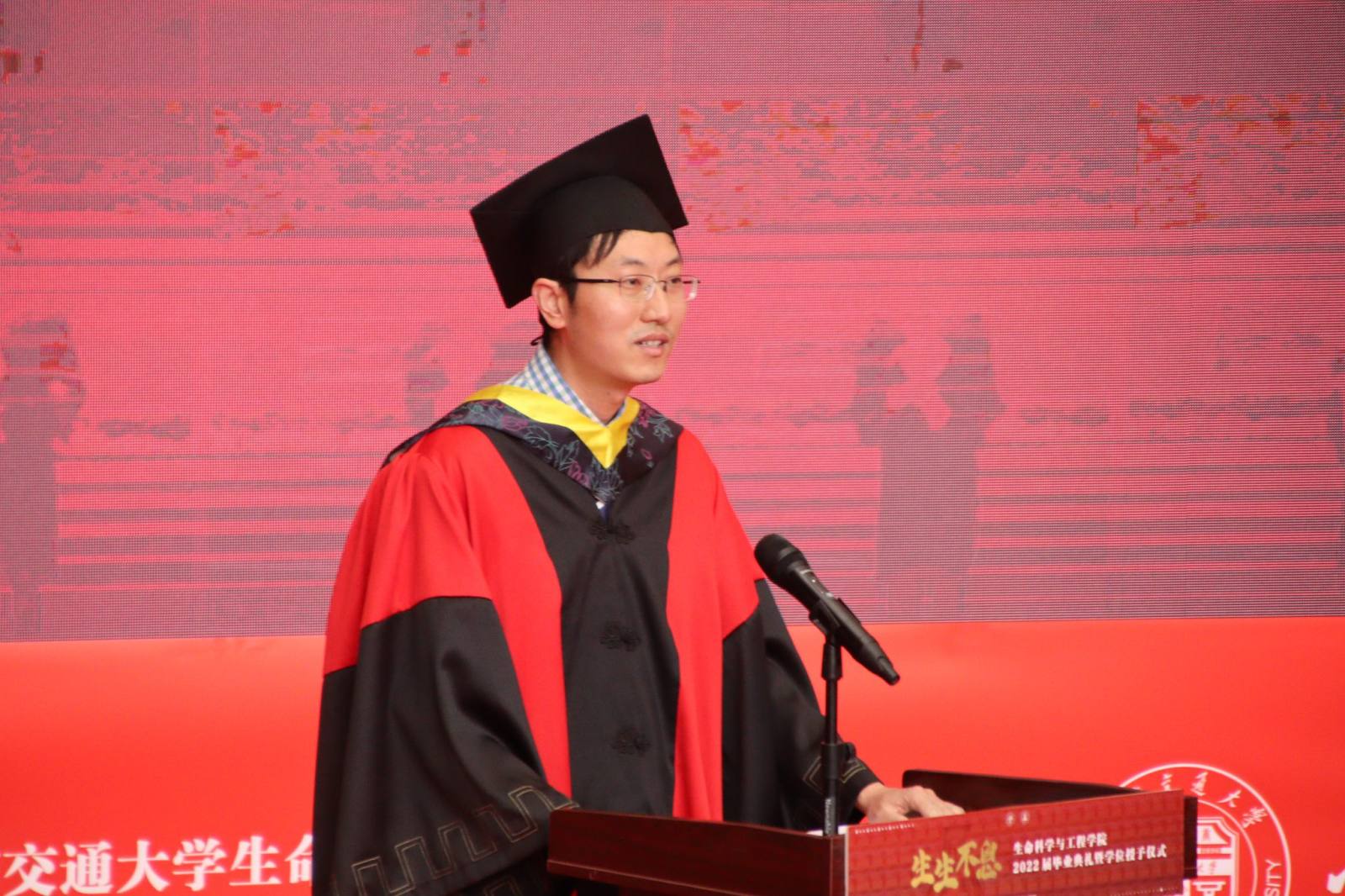 教师代表、药学系主任万军发言。他以幽默的口吻带同学们回顾了在学校的成长历程,分享了作为教师教书育人的自豪感和幸福感,希望同学们“走”得再远,“飞”得再高,也不要忘记常回交大看看,学院永远是同学们最坚强的后盾。