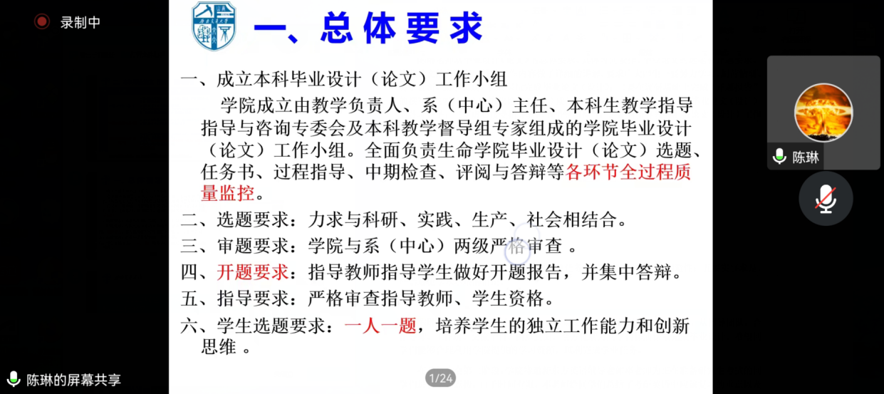 陈琳老师从毕业设计(论文)的总体要求、具体时间安排、毕业论文的选题和开题要求、毕业论文的各阶段安排及工作内容做了详细的讲解,要求广大师生一要努力学习、刻苦钻研、勇于创新、勤于实践,保质保量完成毕业论文(设计);二要在调研基础上完成“开题报告”的撰写;三要对本人的毕业论文(设计)质量负责,必须在规定时间内完成毕业论文(设计)的各项任务;三要虚心接受指导教师的指导和检查,定期向指导教师汇报论文(设计)工作进度;四要学生必须独立完成规定的全部任务,充分发挥主动性和创造性;五要实事求是,严禁避免学术不端的情况。