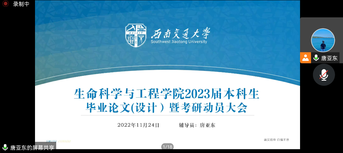 最后,辅导员唐亚东老师对大会进行总结,希望同学们遵守学术诚信与道德,以最真实、最热情、最饱满的状态做好大学四年最关键的事情,为未来发展奠定坚实的科学实践基础,同时也表达了对考研学子的关怀与祝福,希望各位考研的同学能够稳住信心,调整状态,全力冲刺,成功上岸。