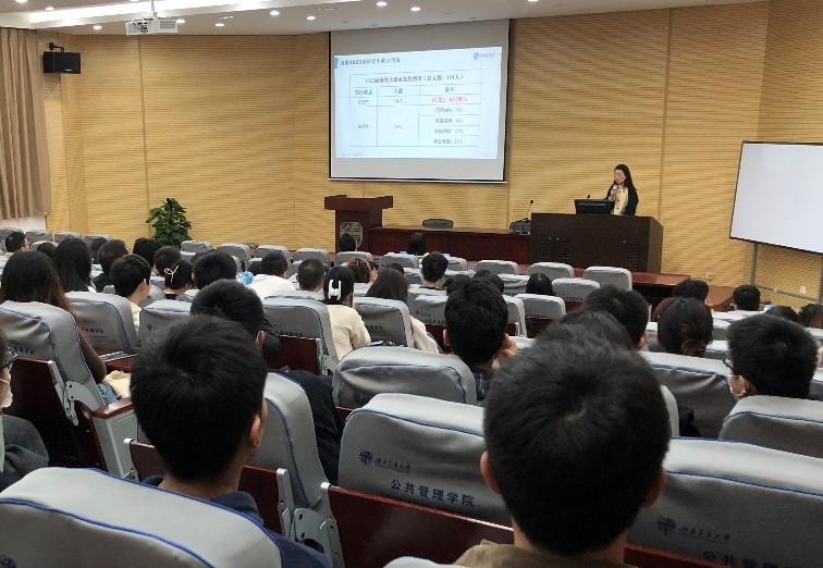 会议第三项,针对就业工作,研究生辅导员饶欢首先向同学们通报了学院当前研究生签约情况、就业单位分布情况;然后针对尚未就业同学,进行了专题辅导。
