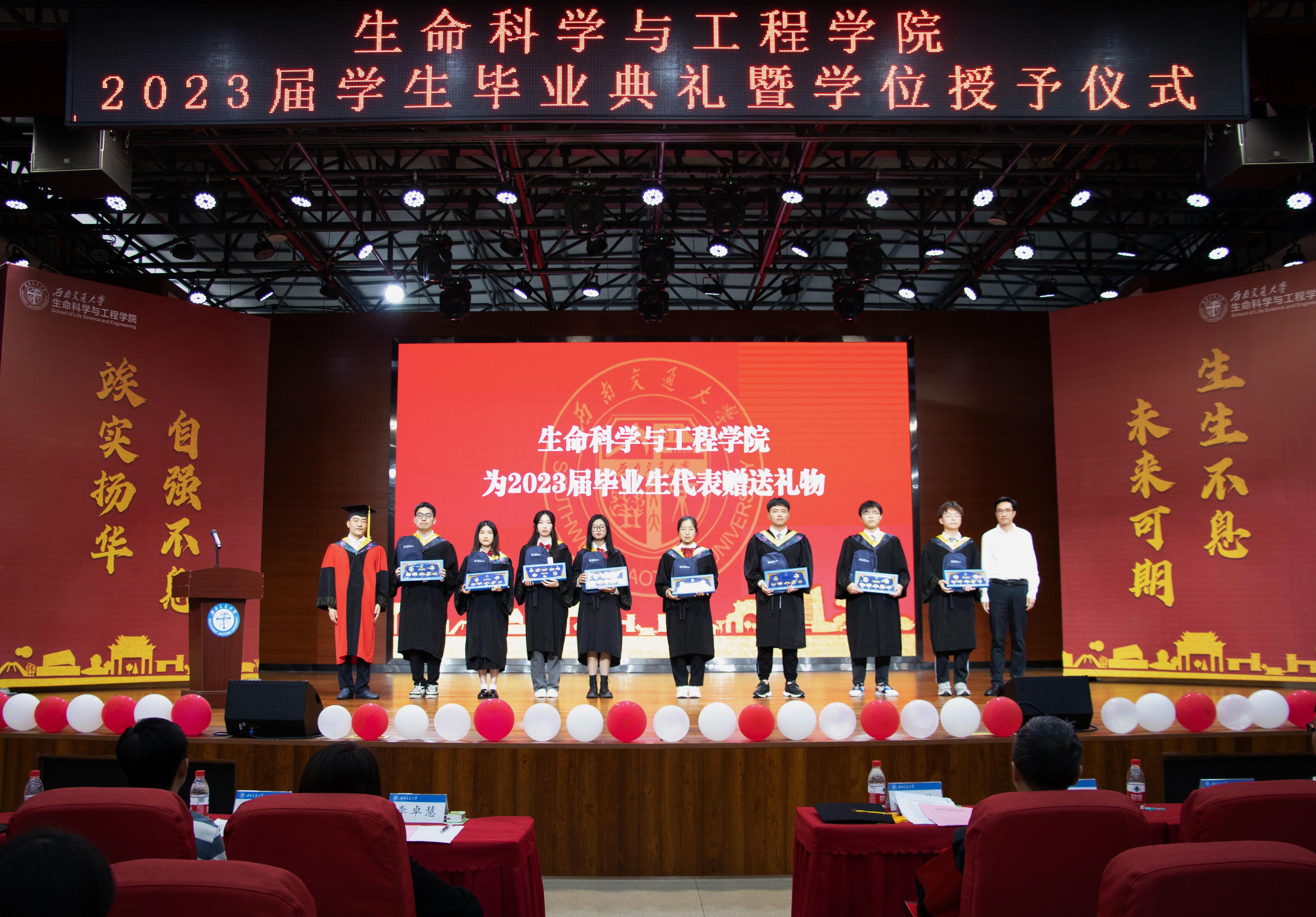 在典礼上,2023届毕业生为学院精心准备了一幅《生生不息、未来可期》的精美画卷,以表达他们对学院的感激之情和美好祝愿。学校、学院也为所有2023届毕业生精心准备并赠送毕业礼物,有带着犀湖的灿灿灯海、伴你奔赴热爱的书签礼盒;有记录你无悔青春,伴你芳华绚烂愿的纪念U盘;有带着母校祝福,伴你跨越山海的便携背包。