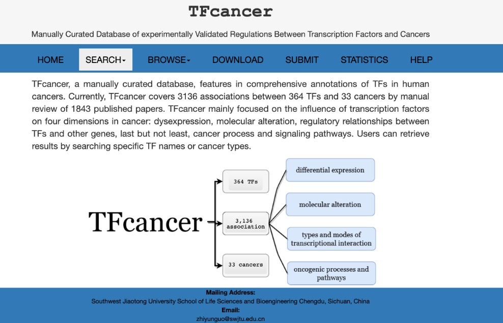 Summary: Transcription factors (TFs) are critical regulation elements and its dysregulation can lead to a variety of cancers. However, currently, there are no such online resources for large-scale collection, storage and analysis of TF-cancer associations in those cancers. To fill this gap, we present a database called TFcancer (//lcbb.xinmacaulhc.com/tfcancer/), which contains 3,136 experimentally supported associations between 364 TFs and 33 TCGA cancers by manually curating more than 1,800 literature. TFcancer mainly concentrates on four aspects: TF expression, molecular alteration, regulatory relationships between TFs and target genes, and biological processes and signaling pathways of TFs in cancers. TFcancer not only provides a user-friendly interface for browsing and searching but also allows flexible data downloading and user data submitting. It is believed that TFcancer is a helpful and valuable resource for researchers who seek to understand the functions and molecular mechanisms of TFs involved in human cancers.