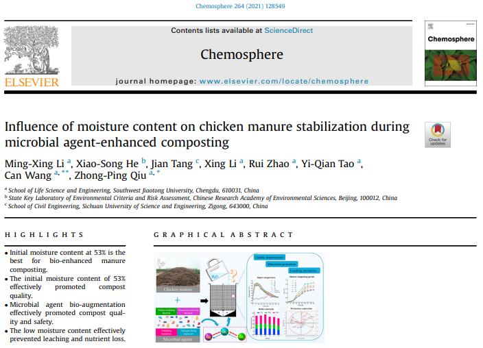 邱忠平教授团队在环境科学与生态学领域TOP期刊《Chemosphere》(IF=7.086)上发表了题为《Influence of moisture content on chicken manure stabilization during microbial agent-enhanced composting》的研究文章。该论文是ESI高被引论文(发表1年内引用次数超30次),以新澳门六合彩资料